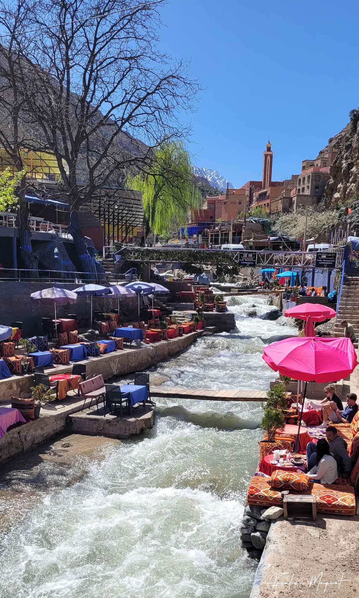 Après l’effervescence de la ville, j’ai ressenti le besoin d’un grand bol d’air. En route vers l’Atlas et la vallée de l’Ourika, le paysage change radicalement. Les palmiers cèdent la place aux arganiers et aux petits villages berbères accrochés aux flancs des montagnes. Le trajet est une invitation à la contemplation, chaque virage révélant des panoramas grandioses. La vallée elle-même, avec sa rivière et ses fameuses cascades de Setti Fatma, est un lieu où la nature reprend ses droits. Une marche revigorante dans un cadre spectaculaire, loin du bruit de la ville.
