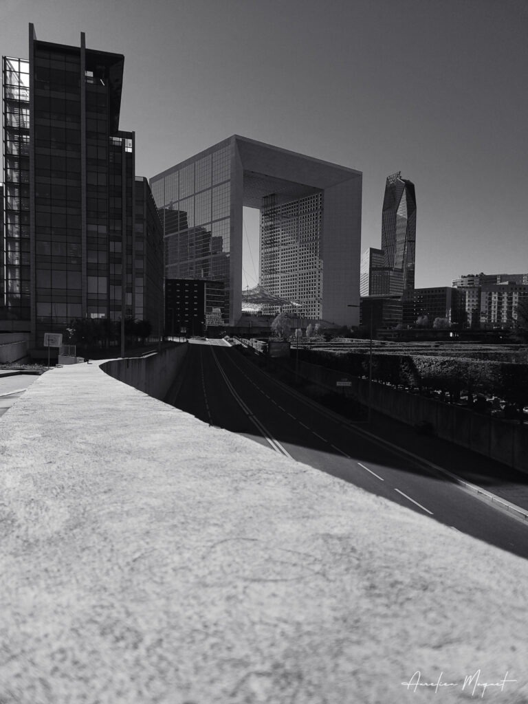Dès l’arrivée, l’œil est saisi par l’immensité de la Grande Arche. Dans cet angle, le contraste est saisissant : le premier plan texturé d’un muret, l’ombre nette projetée sur la route et, au loin, la silhouette massive de l’Arche se détachant sur un ciel limpide. C’est le point de départ de ma déambulation.