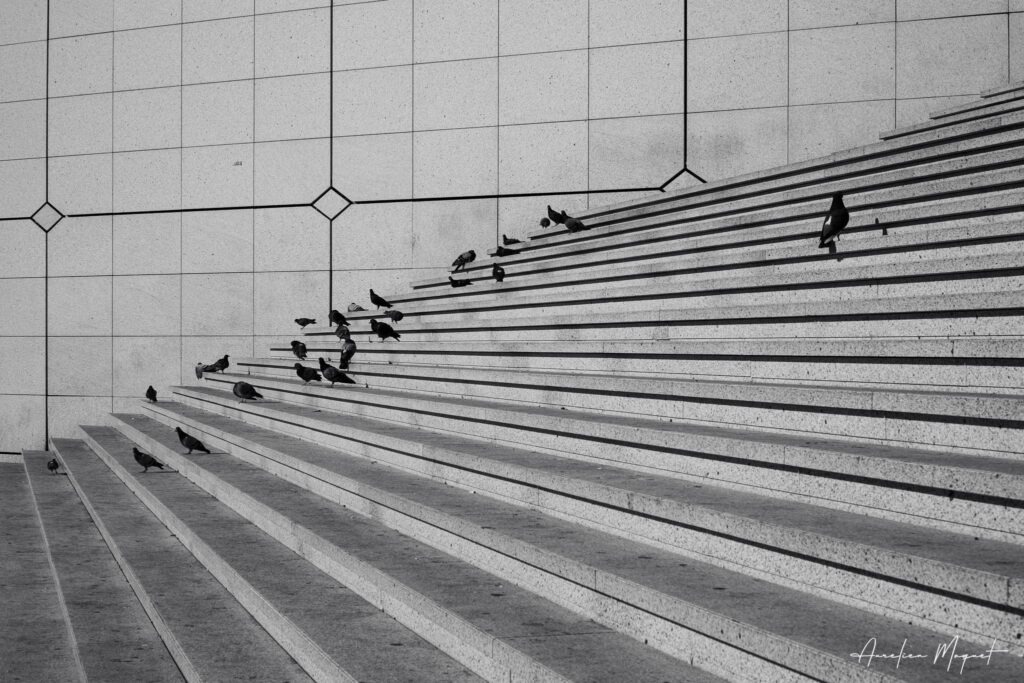 Juste derrière la Grande Arche, un autre spectacle commence. Ces marches monumentales, conçues comme un amphithéâtre urbain, sont le domaine des pigeons. J’aime cette composition où l’ordre des lignes architecturales rencontre le désordre apparent des oiseaux. Un moment de pause, simple et presque poétique, au milieu des tours de verre.