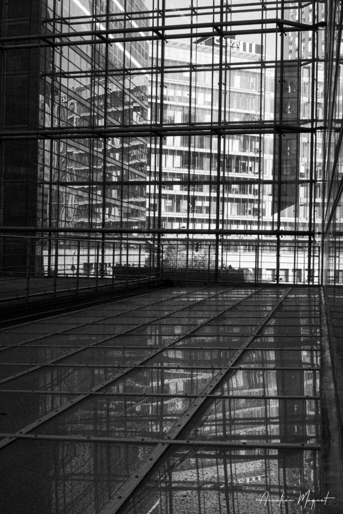 En poussant l’exploration, l’architecture joue avec nos sens. Pris à travers une structure métallique, ce point de vue met en scène un jeu complexe de reflets. Les vitres au sol transforment l’espace, mélangeant le ciel et les façades environnantes dans un puzzle de lignes et de lumières. Une vision fragmentée qui invite à l’observation.