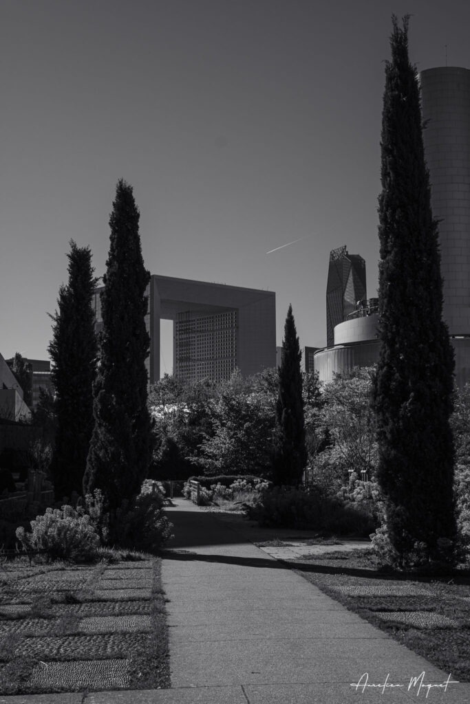 Enfin, je ne pouvais pas quitter La Défense sans capturer ce contraste saisissant. Entre des cyprès au premier plan et des espaces verts soignés, la Grande Arche et les tours environnantes s’effacent presque. Une vision plus douce, où la nature et le béton cohabitent harmonieusement. C’est ce type d’image qui rappelle l’importance de préserver des espaces de respiration au cœur des villes.